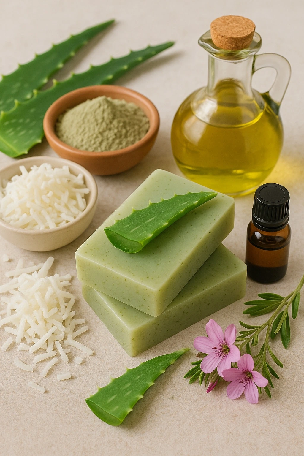 Begin by melting the glycerin soap in a double boiler until smooth and liquid. Stir in the aloe vera gel and mix well so it fully blends. Add the green clay and olive oil, stirring until everything is evenly incorporated. If you’d like, add a few drops of rosemary or lavender essential oil for a calming scent, then mix again. Finally, pour the mixture into silicone molds and allow it to cool completely until solid. Once set, gently remove the soaps from the molds and they’re ready to use.